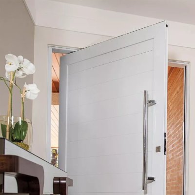 As portas pivotantes adicionam estética e elegância a qualquer projeto. Ideais para serem utilizadas na entrada de casas e apartamentos, parte da porta é projetada para fora, o que permite a escolha de modelos maiores e com design mais arrojado.